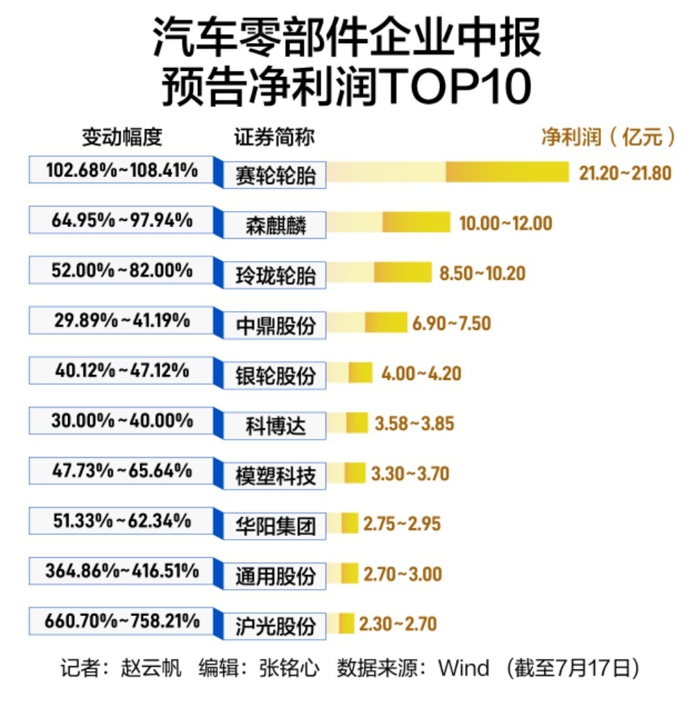 在已经披露上半年业绩预告的所有63家汽车零部件企业中,赛轮轮胎(601058.SH)、森麒麟(002984.SZ)、玲珑轮胎(601966.SH)三家轮胎企业分别以21.2亿元~21.8亿元、10亿元~12亿元、8.5亿元~10.2亿元的归母净利润,位列所有汽车零部件企业前三。