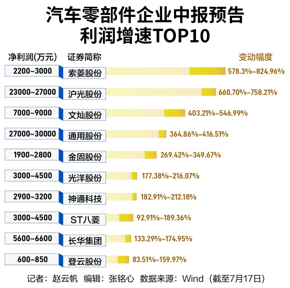 Wind数据显示,截至7月17日,在203家Wind汽车零部件成分企业中,共有63家公司披露了上半年业绩预告。其中,高达49家公司实现了正归母净利润,约50家公司实现业绩同比正增长,预喜企业占比高于许多其他行业。